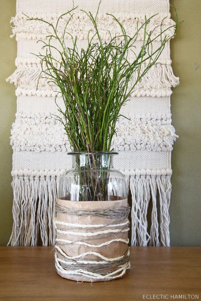 nehmt die passende Schnur und wickelt sie um die Vase. Eurer Kreativität sind hier keine Grenzen gesetzt! Mit einem kleinen Knoten fixiert ihr die Schnur.