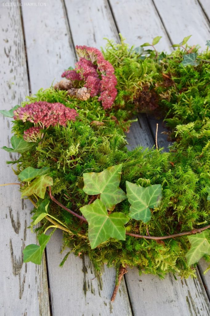 Gesagt – getan! Am Feiertag ging es mit Mr. Eclectic, Lucy und Eloise in den Wald zum Moos sammeln. Nach einem langen und erfolgreichen Spaziergang kehrten wir ins Hamilton zurück und Mr. Eclectic kochte uns eine Kürbissuppe während ich Kläres Mooskranz auf der Terrasse bei herrlichem Sonnenschein gebunden habe.