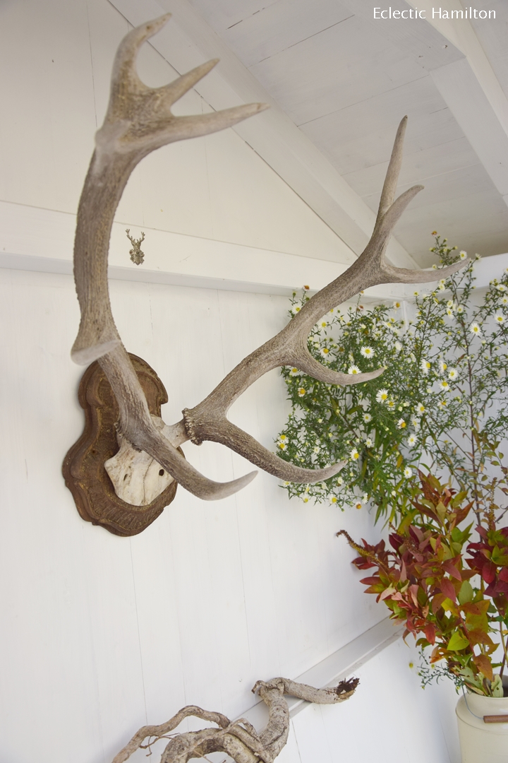 Kurzerhand habe ich am letzten Wochenende das Bild abgehängt und Mr. Eclectic hat mir ein Hirschgeweih, dass ich vor über 2 Jahren auf dem Flohmarkt gekauft habe und seitdem in der Garage auf seinen Einsatz wartet, an die Rückwand gehängt.