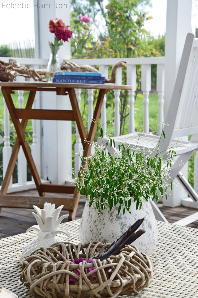 Wenn Mr.Eclectic und ich hier nicht gerade Frühstücken oder das Abendessen genießen (wegen der vielen Mücken ;-)), dann sind kleine Deko-Arrangements auf dem Tisch.