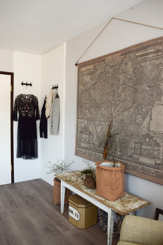 Ich habe einen gemütlichen Sessel in die Ecke gestellt, eine riesige antike Paris-Leinwand aufgehängt und dann wollte ich meine neu erworbenen Bäumchen vom Floristen dekorieren.