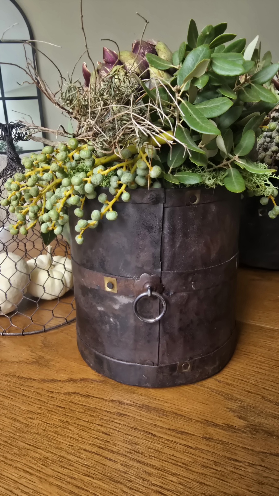 Toller antiker Übertopf aus altem Metall und mit wunderschönen Details: Nieten und kleinen Ringen!