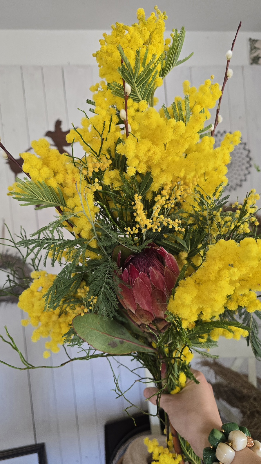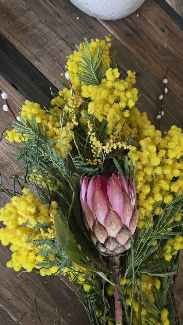 Du erhältst zum Selbstarrangieren: Mimosen, Protea, Heidelbeere und Weidekätzchen