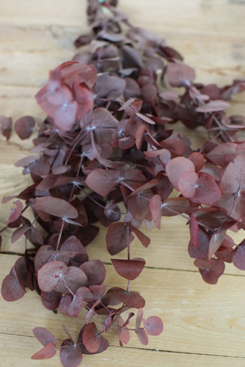 Der Eukalyptus ist konserviert und rot-braun eingefärbt. Er eignet sich hervorragend zum Kranzbinden, aber auch auch für deine Arrangements aus Trockenblumen.