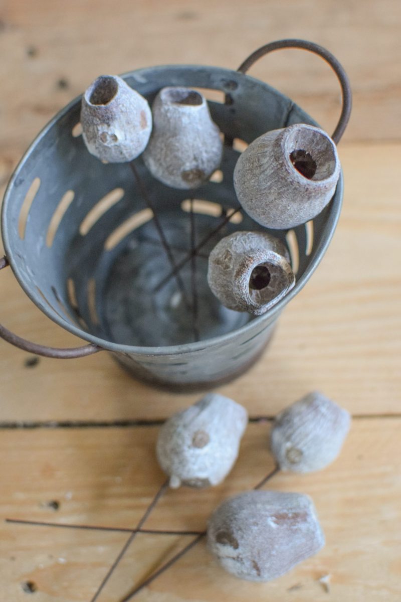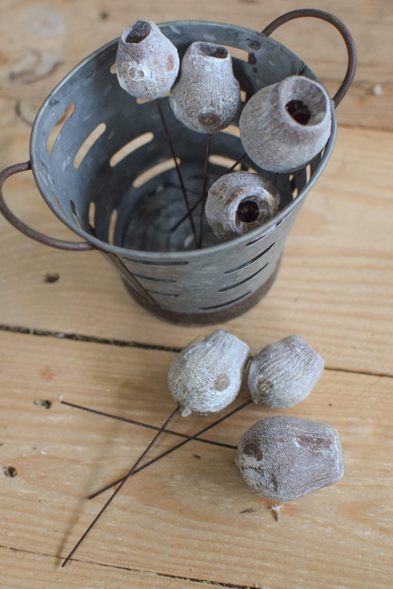 Die Eukalyptus Kapsel ist geweißt und auf einem Metallstecker angebracht und eignet sich somit hervorragend für deine Naturdeko-Ideen.