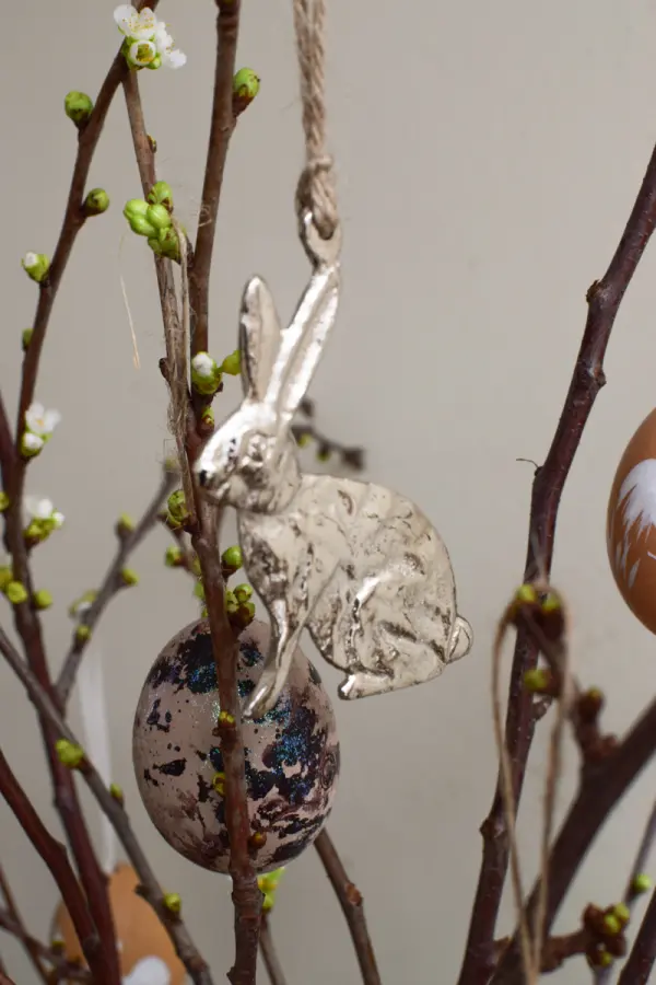 Ein wunderschöner stilvoller Hase aus Metall mit kleiner Kordel zum Aufhängen.