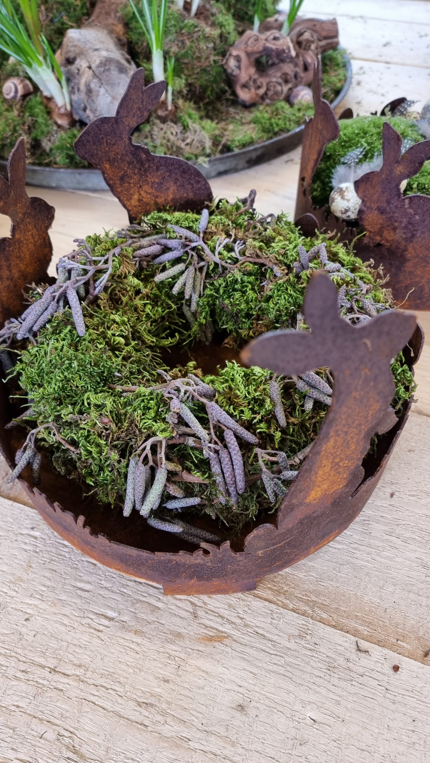 Du kannst in das große Hasentablett auch ganz easy einen kleinen Mooskranz drapieren (Strohkranzdurchmesser: 20 cm)
