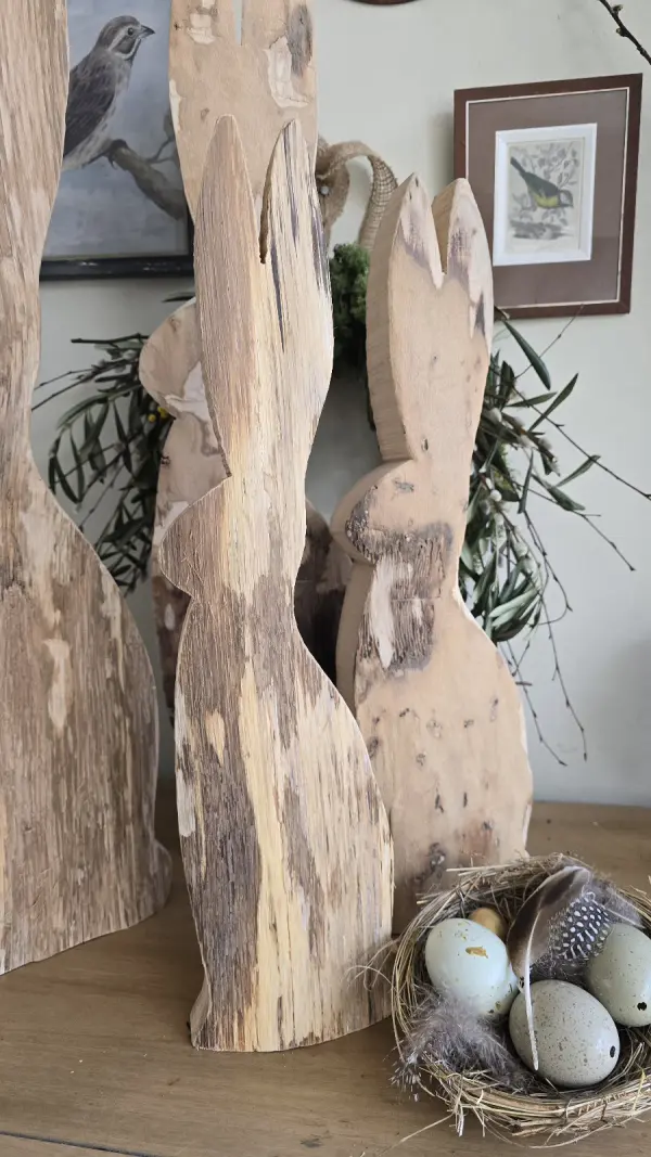 Der Hase wurde aus frisch geschlagenem unbehandelten Holz gefertigt. Durch die Verwendung von frischem Holz entstehen im Laufe der Zeit Trocknungsrisse, die diesem Hasen sein charakteristisches und rustikales Erscheinungsbild verleihen. Deshalb ist jedes Stück einzigartig.