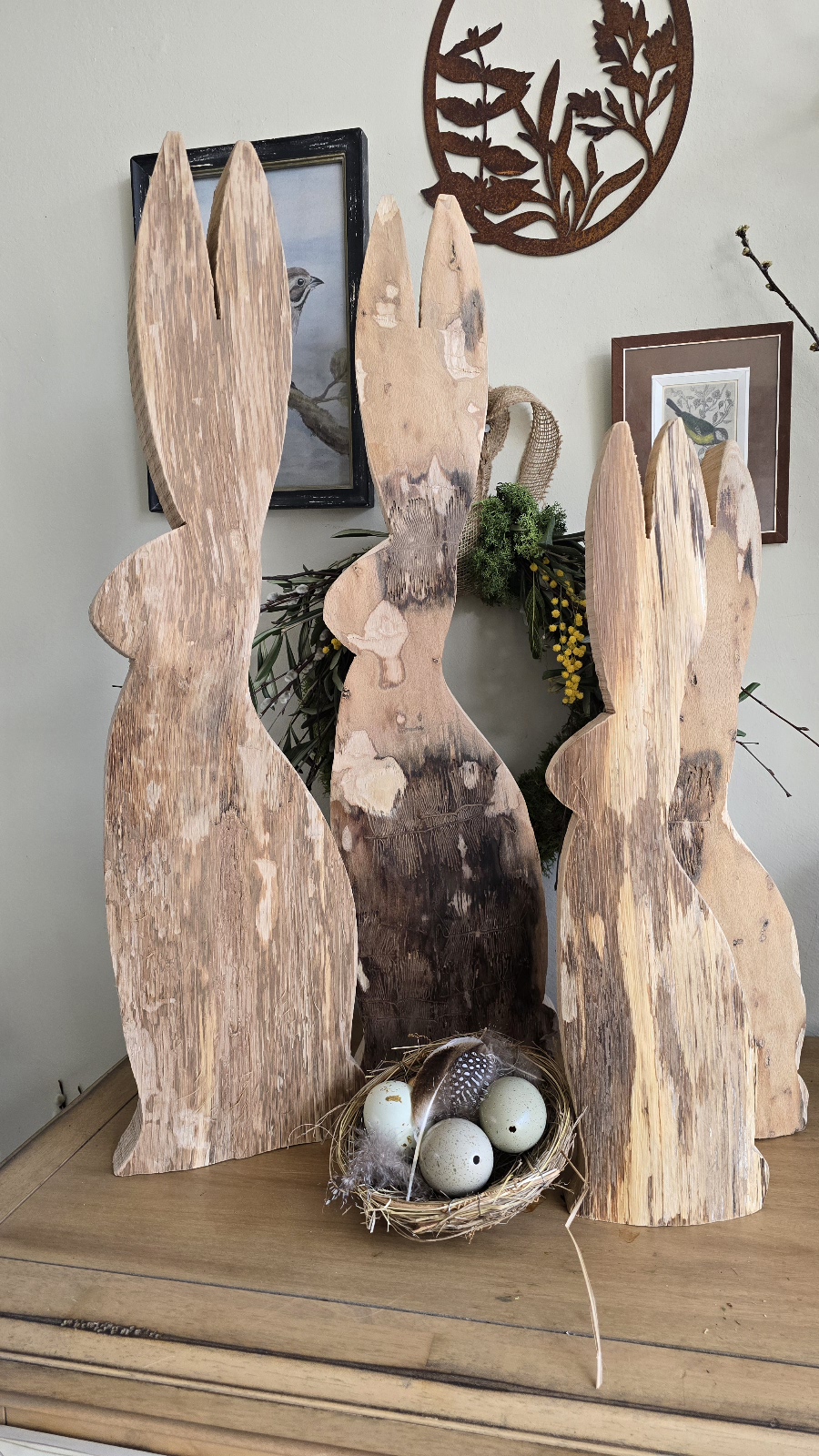 Der Hase wurde aus frisch geschlagenem unbehandelten Holz gefertigt. Durch die Verwendung von frischem Holz entstehen im Laufe der Zeit Trocknungsrisse, die diesem Hasen sein charakteristisches und rustikales Erscheinungsbild verleihen. Deshalb ist jedes Stück einzigartig.