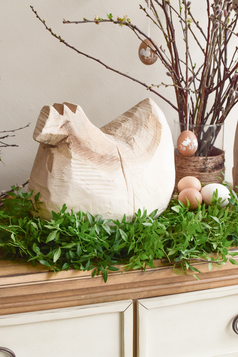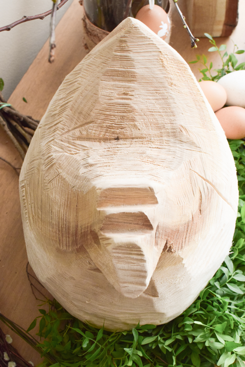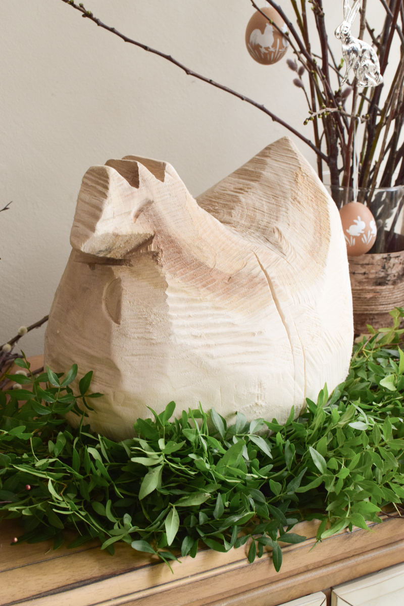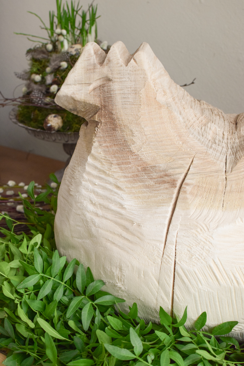 Die Henne wurde aus frisch geschlagenem unbehandelten Holz gefertigt. Durch die Verwendung von frischem Holz entstehen im Laufe der Zeit Trocknungsrisse, die dieser Henne sein charakteristisches und rustikales Erscheinungsbild verleihen. Deshalb ist jedes Stück einzigartig.