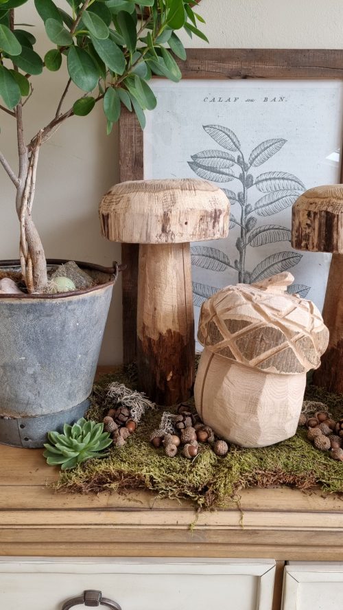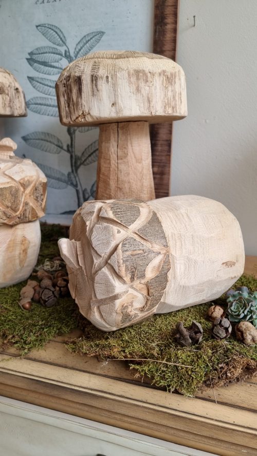 Der Pilz wurde aus frisch geschlagenem unbehandelten Holz gefertigt. Durch die Verwendung von frischem Holz entstehen im Laufe der Zeit Trocknungsrisse, die diesem Pilz sein charakteristisches und rustikales Erscheinungsbild verleihen. Deshalb ist jedes Stück einzigartig.