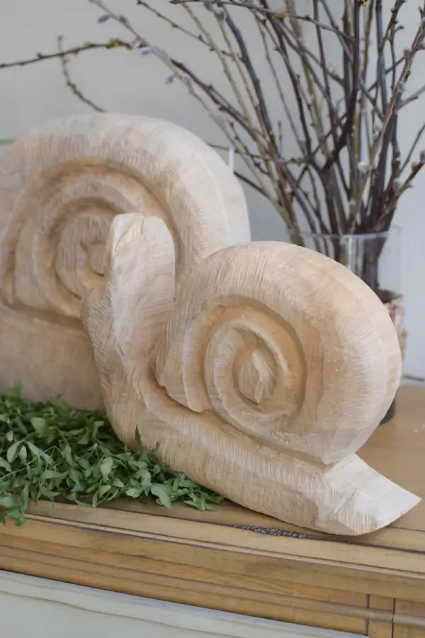 Die Schnecke wurde aus frisch geschlagenem unbehandelten Holz gefertigt. Durch die Verwendung von frischem Holz entstehen im Laufe der Zeit Trocknungsrisse, die dieser Henne sein charakteristisches und rustikales Erscheinungsbild verleihen. Deshalb ist jedes Stück einzigartig.