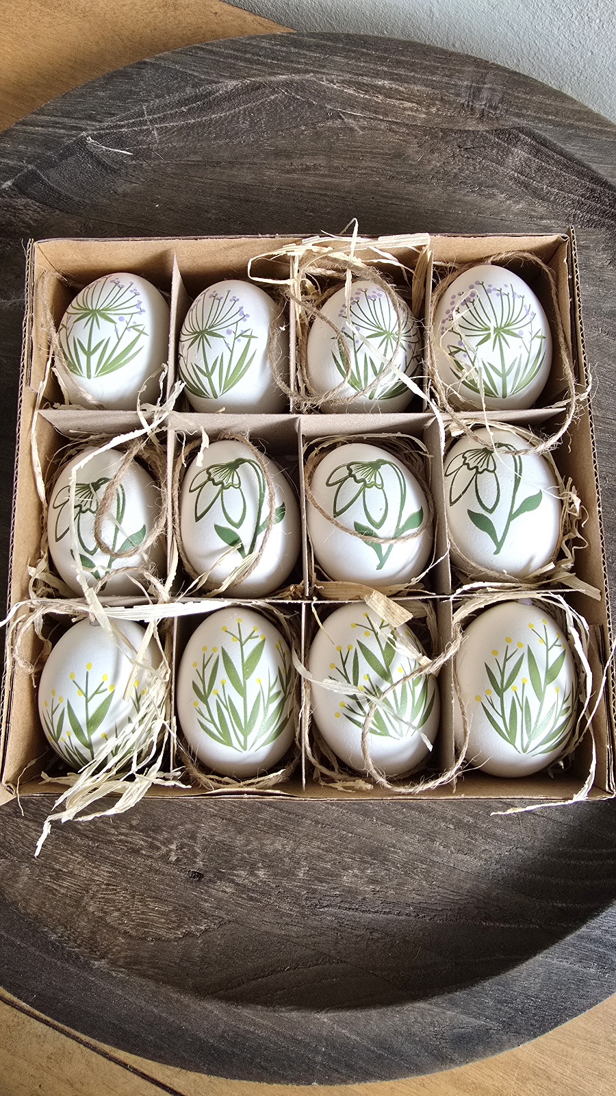 Jedes der zwölf Eier ist individuell bemalt. Durch eine Schnur am oberen Ende können die Eier an einzelnen Zweigen, Sträuchern oder Bäumen befestigt werden.