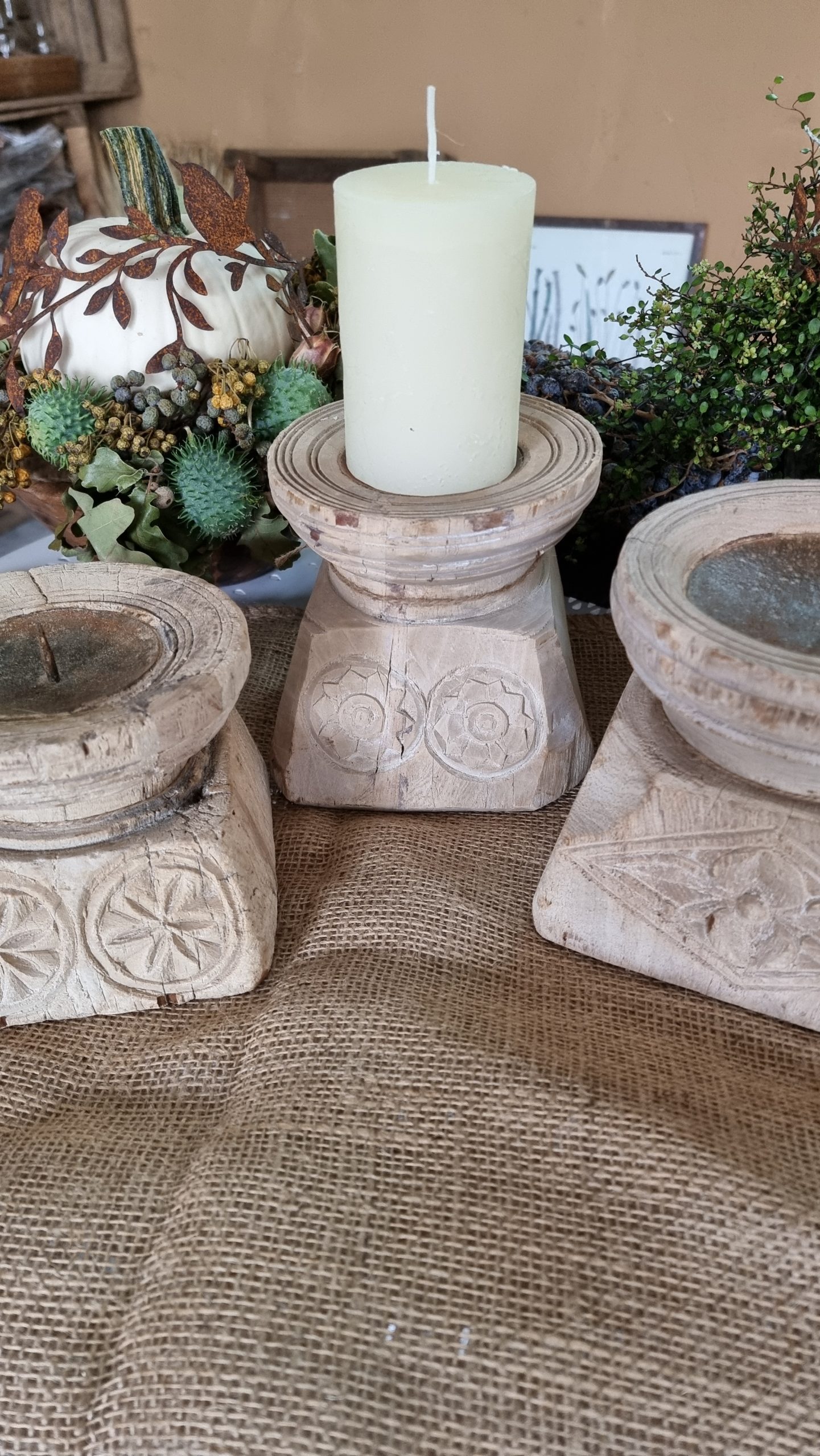 Die weiße Stumpenkerze schafft Stimmung und passt perfekt auf den tollen Holz-Kerzenständer.
