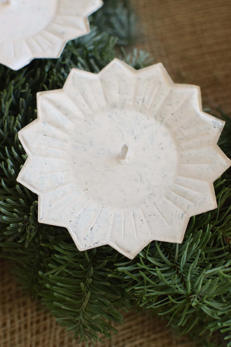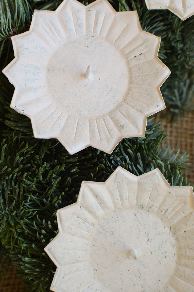 Der Halter ist aus Metall und in einem wunderschön nostalgischen weißen Vintage-Look gestaltet. Die Metallhalter sind nicht einheitlich weiß, sondern etwas melliert und mit einem Shabby-Touch versehen.