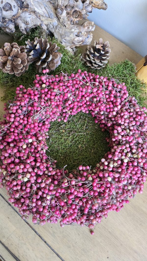 Der Kranzrohling wurde mit Pfefferbeeren beklebt. Perfekt für deine Winter- und Weihnachtsdeko.