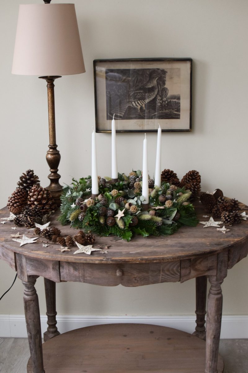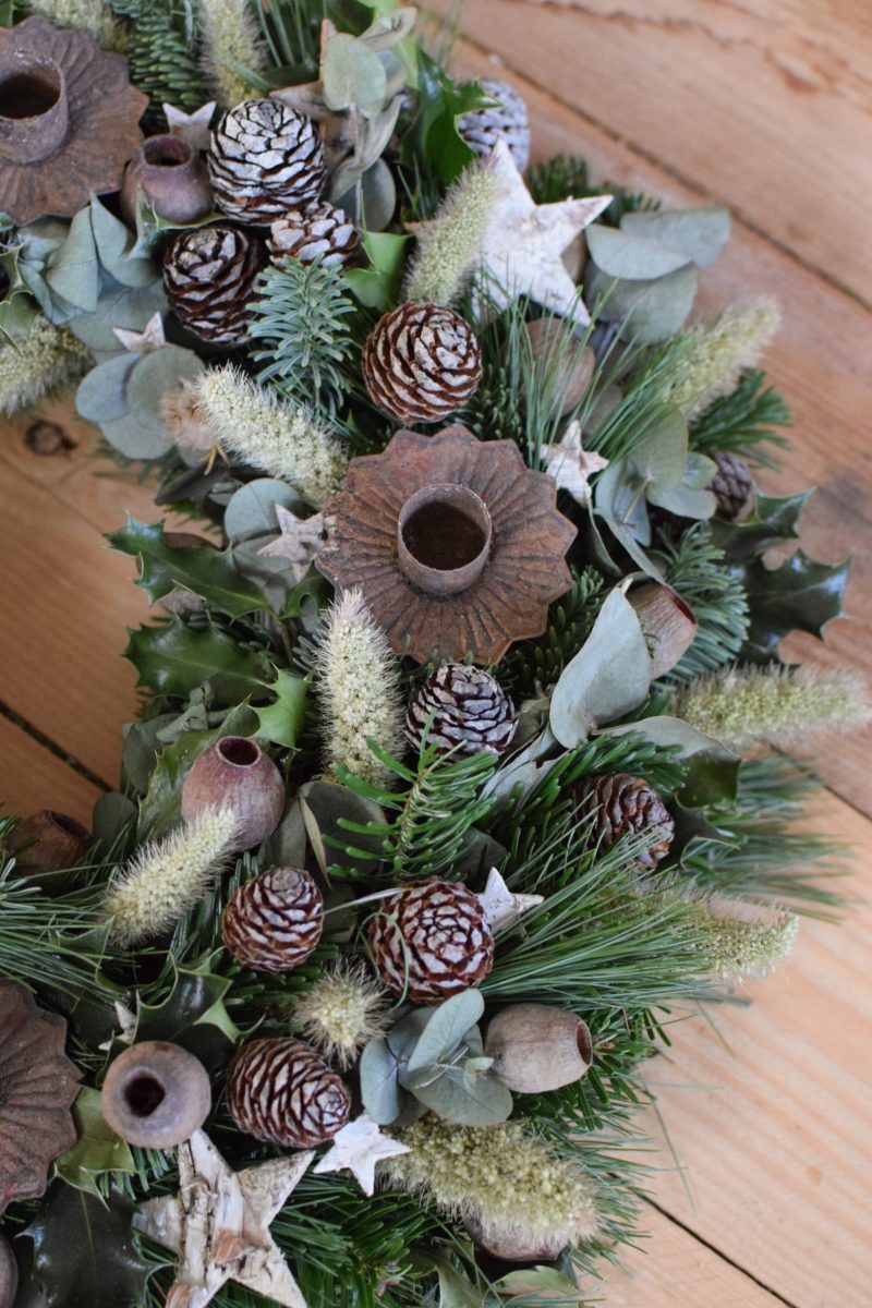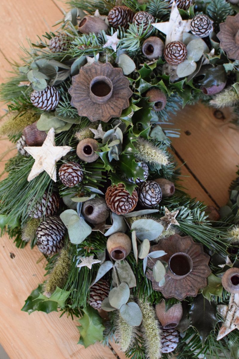 Lass einfach die Kerzenhalter weg und du hast einen tollen Kranz für den Tisch, Sideboard oder Tür!