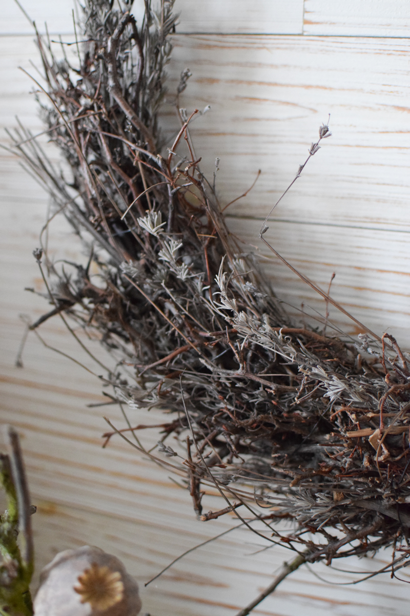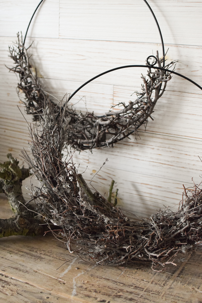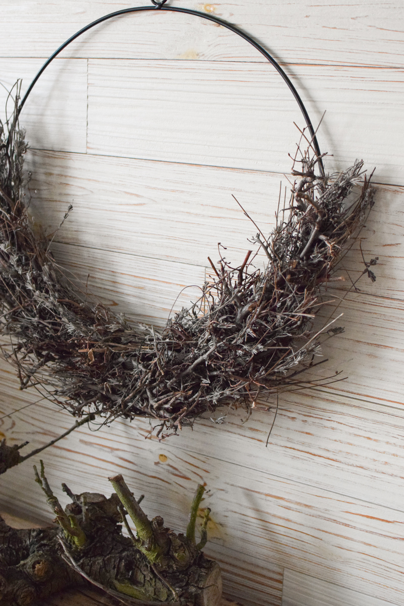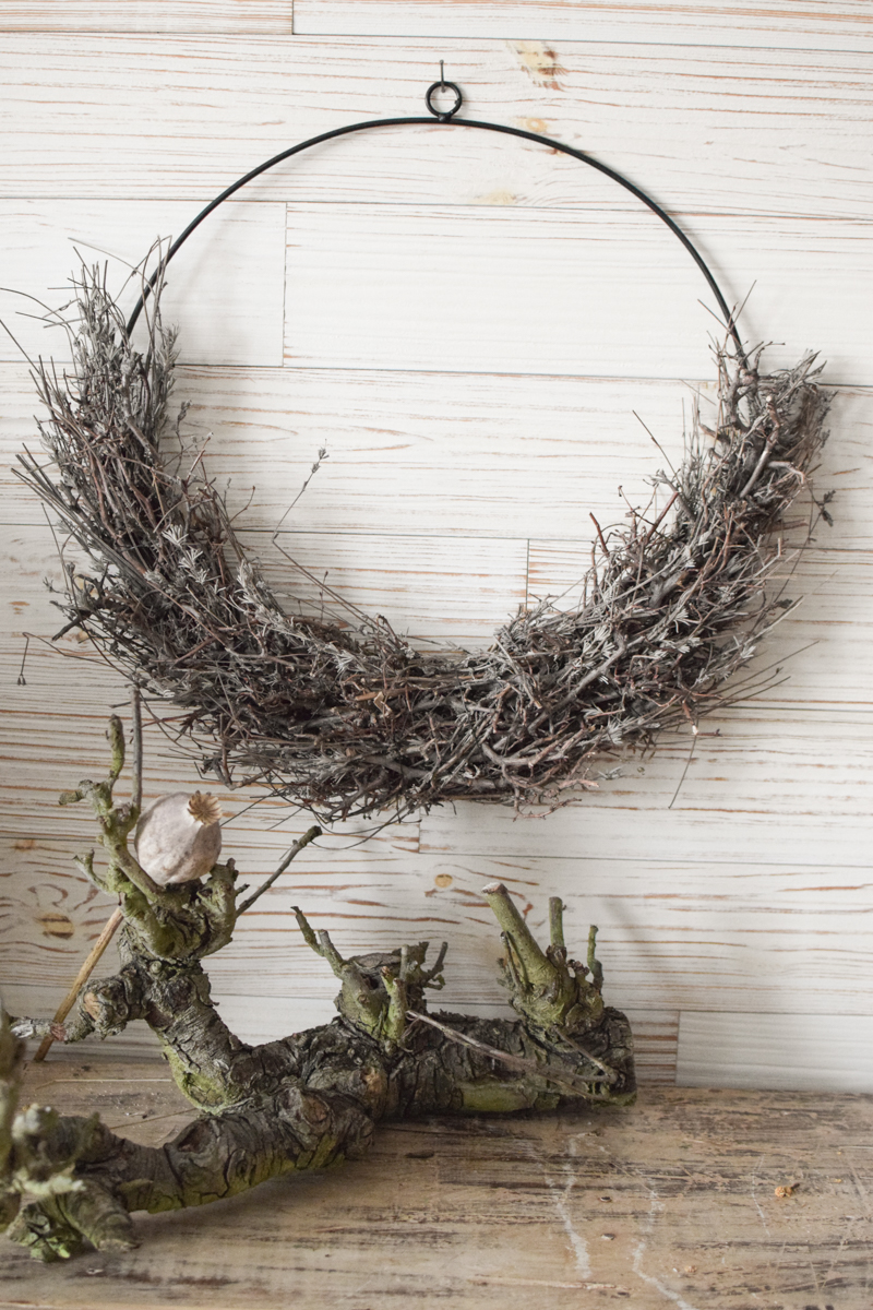 Der Metallring ist schwarz beschichtet, hat einen kleinen Aufhängering und ist in der unteren Hälfte mit getrocknetem Bonsai-Geäst gebunden.