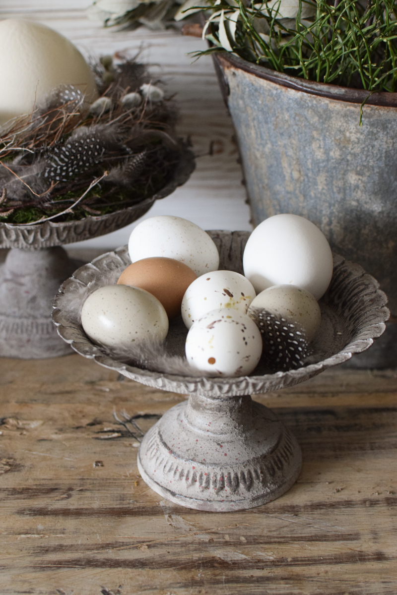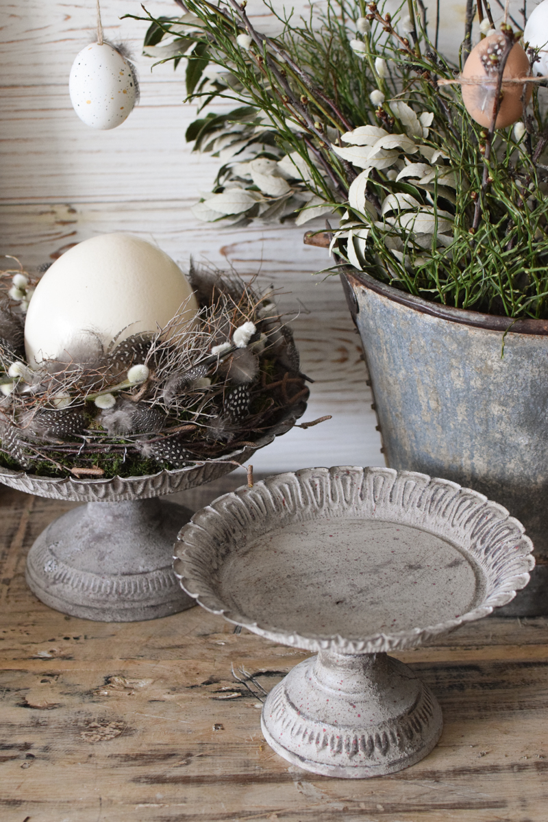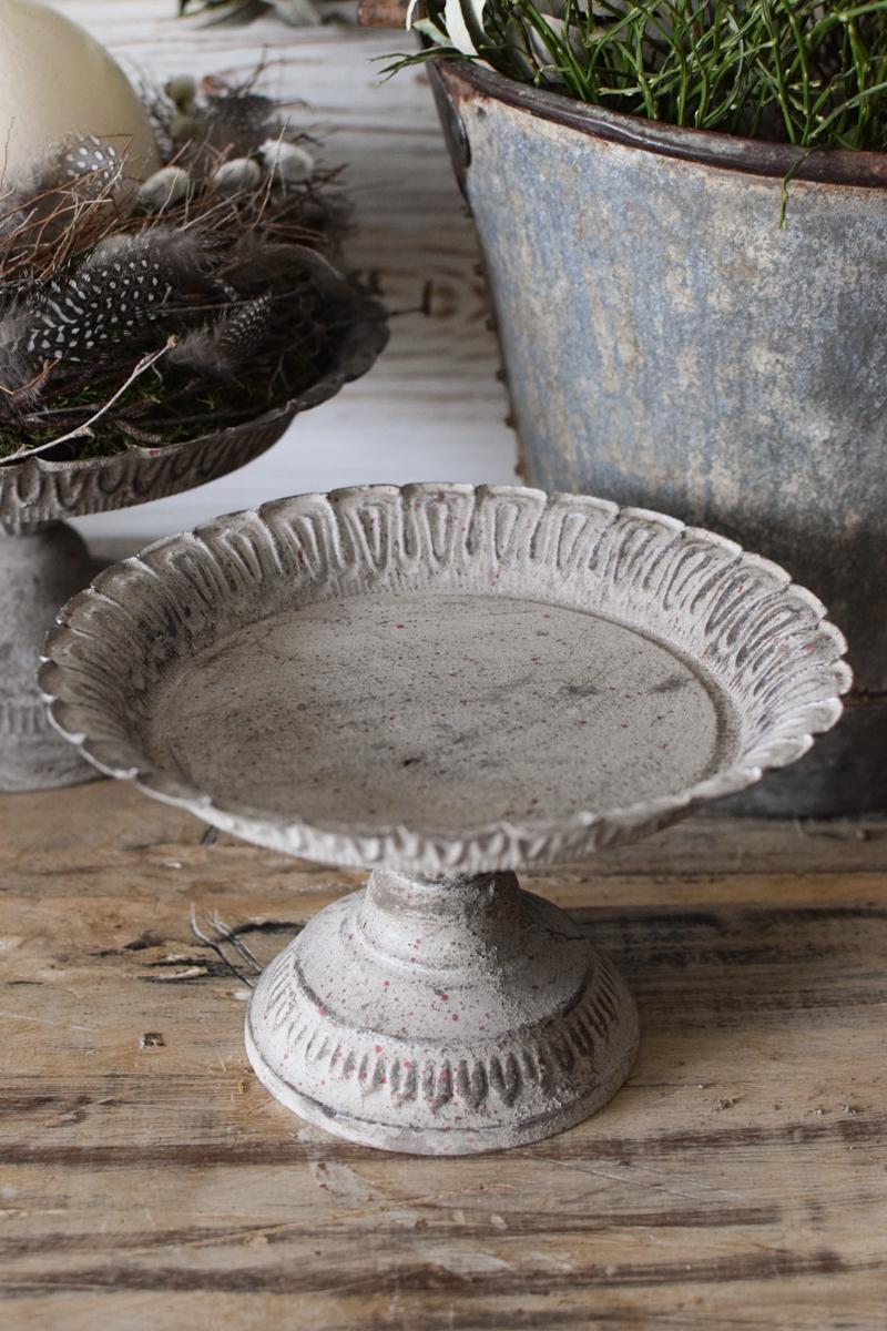 Das runde Tablett ist aus Metall im Vintage-Look.