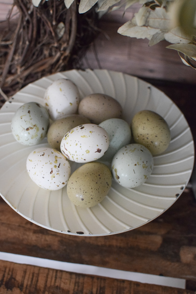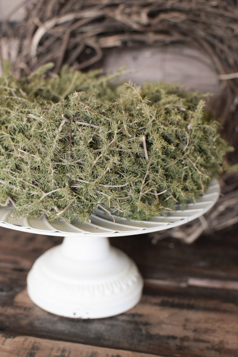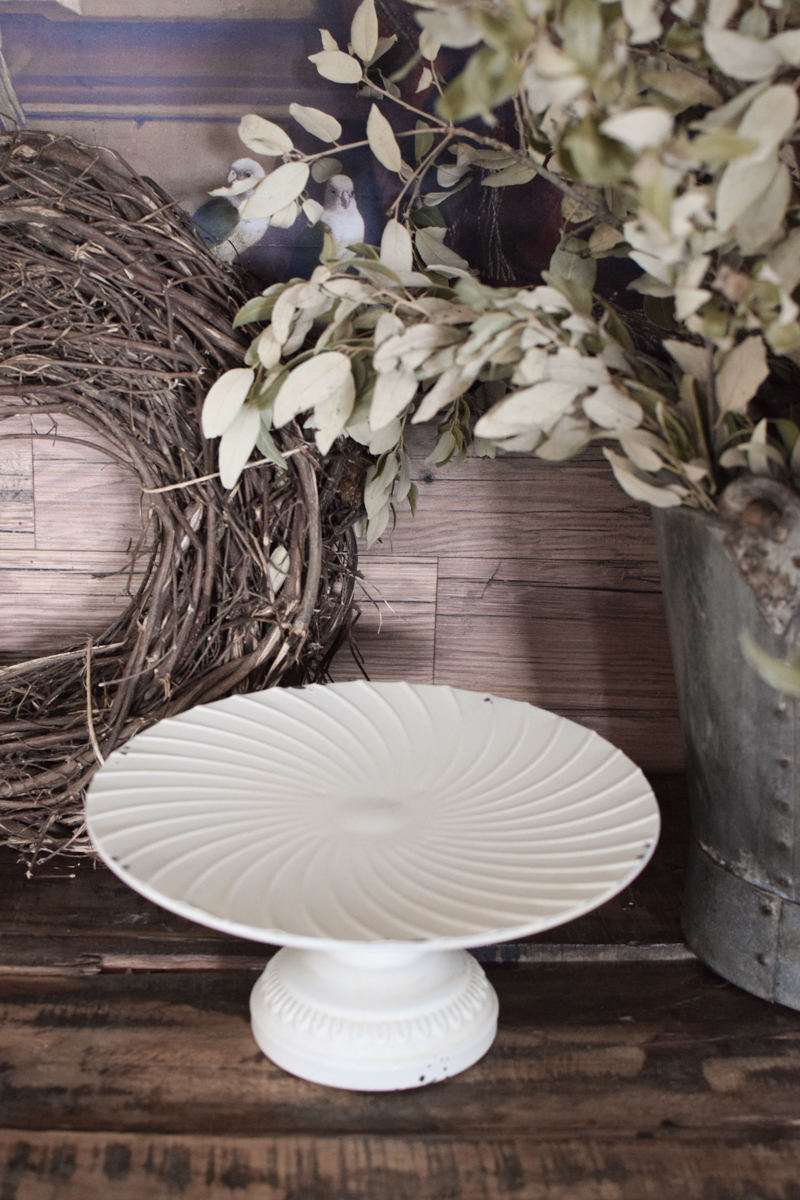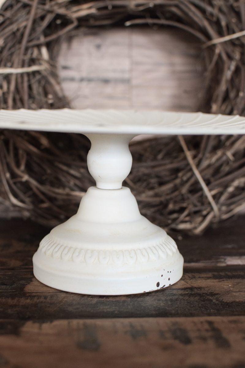 Das runde weiße Tablett ist aus Metall im Vintage-Look.