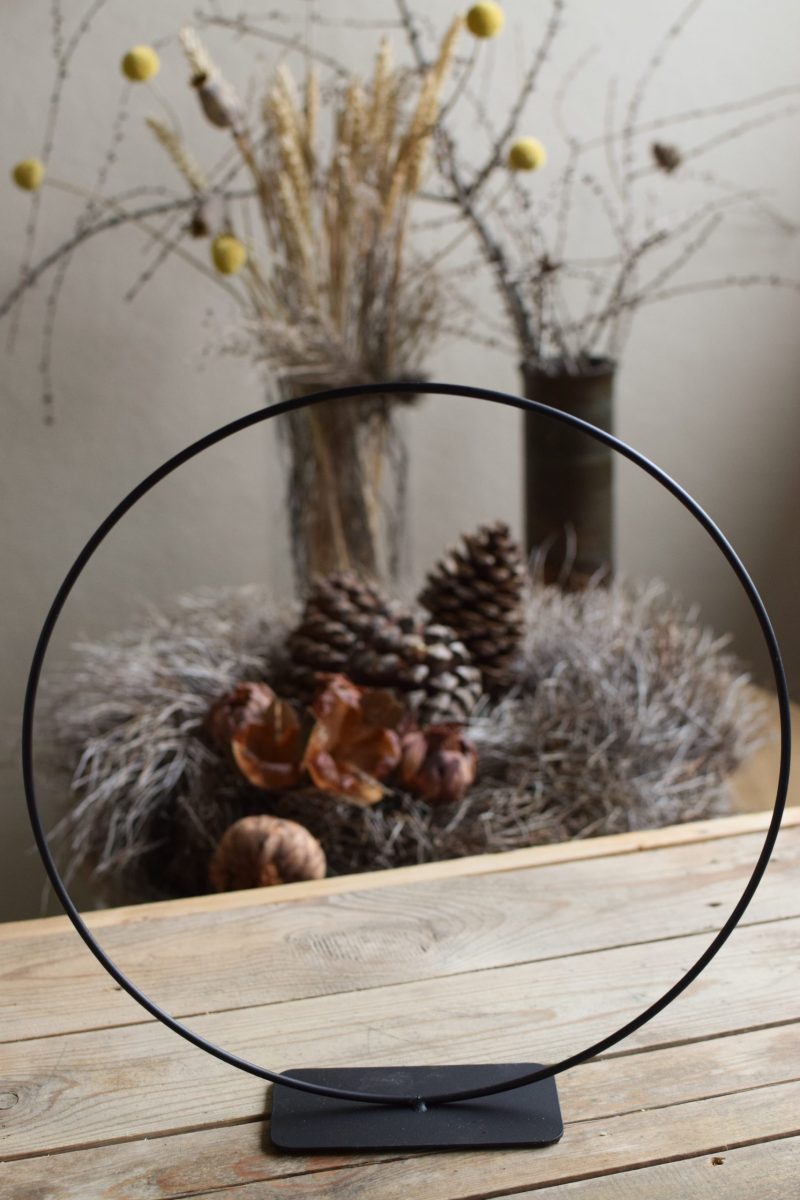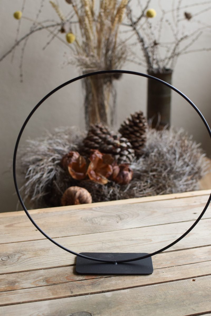Der Metallring ist schwarz beschichtet und hat einen Fuß. Somit kannst du ihn auf Fenstersims, Sideboard oder Tisch dekorieren.