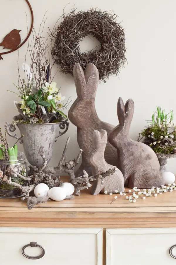 Der Hase wurde aus frisch geschlagenem unbehandelten Holz gefertigt. Durch die Verwendung von frischem Holz entstehen im Laufe der Zeit Trocknungsrisse, die diesem Hasen sein charakteristisches und rustikales Erscheinungsbild verleihen. Deshalb ist jedes Stück einzigartig.