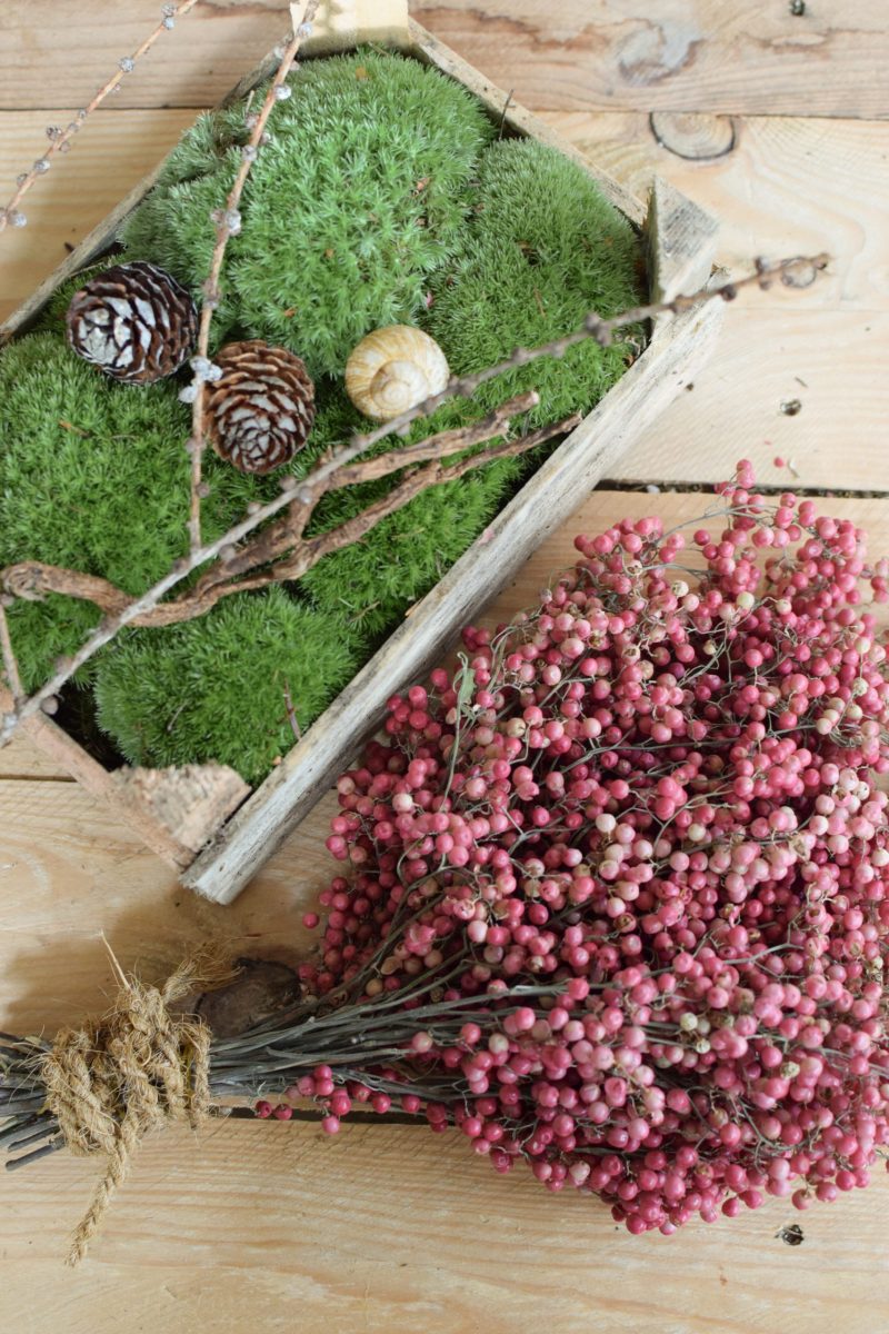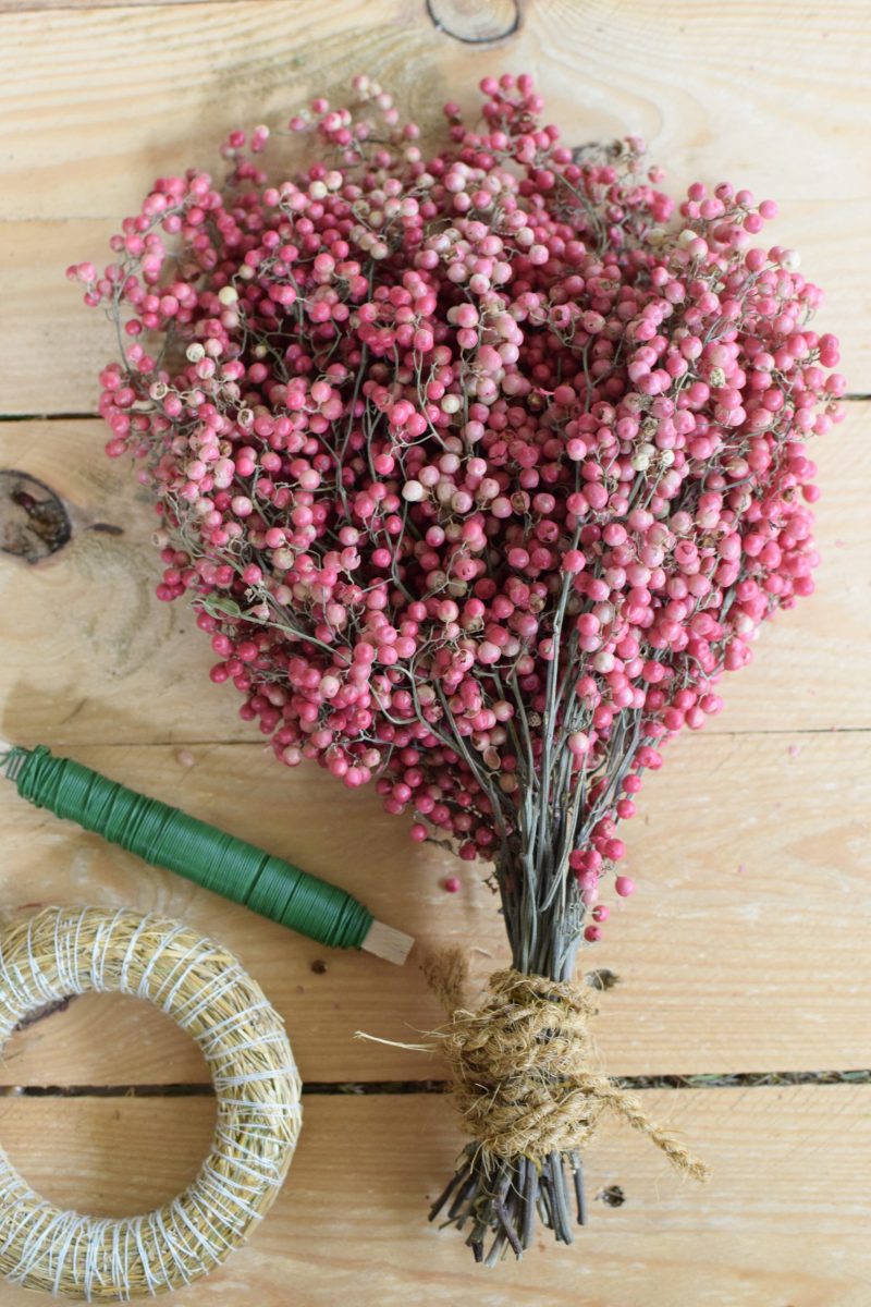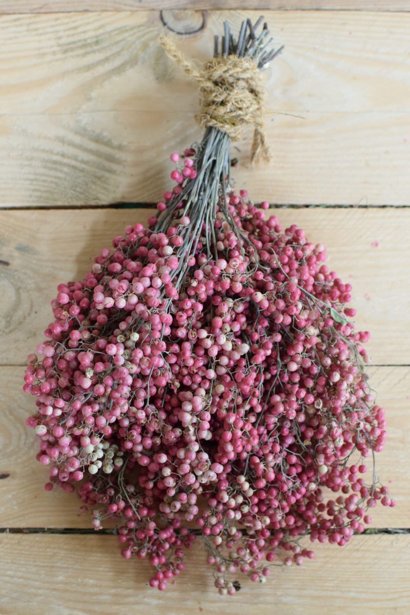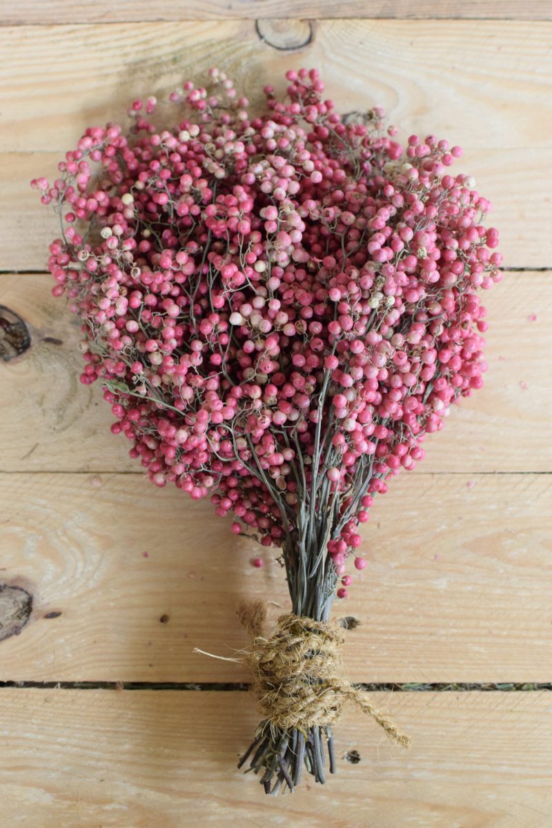Der Bund rosa Pfefferbeeren ist getrocknet und somit ewig haltbar. Du kannst ihn immer wieder neu dekorieren.