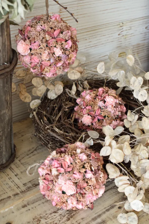 Tolle Kugel aus getrockneten Trockenblumen-Blüten in wunderschönen pastell-rosa Tönen.