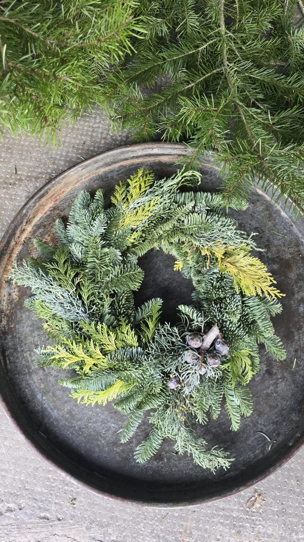 Der winterlich-weihnachtliche Kranz aus verschiedenem Tannengrün bringt Natur in dein Zuhause.