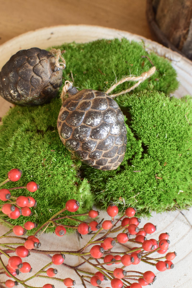 Oh wie schön! Der tolle Holz-Zapfen glitzert in einem tollen dunklen Ton und verschönert im Handumdrehen deine Herbst- und Winterdeko.