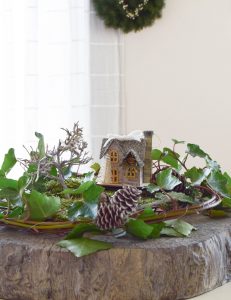 Verträumtes Tisch-Arrangement mit Efeu, Moos und ganz viel Winter