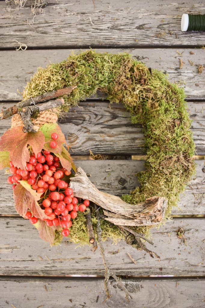 Am nächsten Tag habe ich die Beeren mit Moos und weiteren Fundstücken zu einem Kranz verarbeitet.