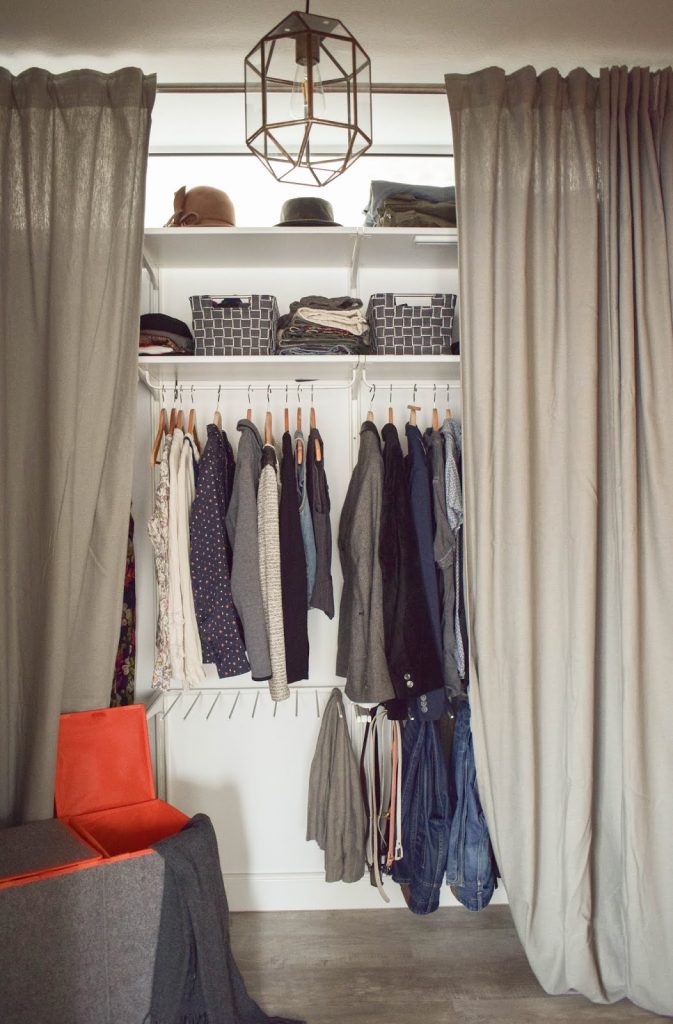 Eine einfache Vorhangstange und schwere Leinenvorhänge schützen die Kleidung vor Staub und Licht. So ist alles schön geschützt.
