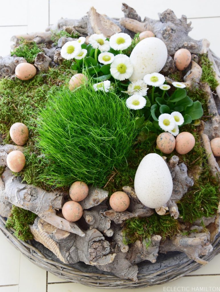 Ich habe den Mooskranz von HIER und meinen Artischocken-Strauß von HIER mit einigen Wachteleiern „aufgeostert“. Ich finde es herrlich schön und der Aufwand ist wirklich minimal!