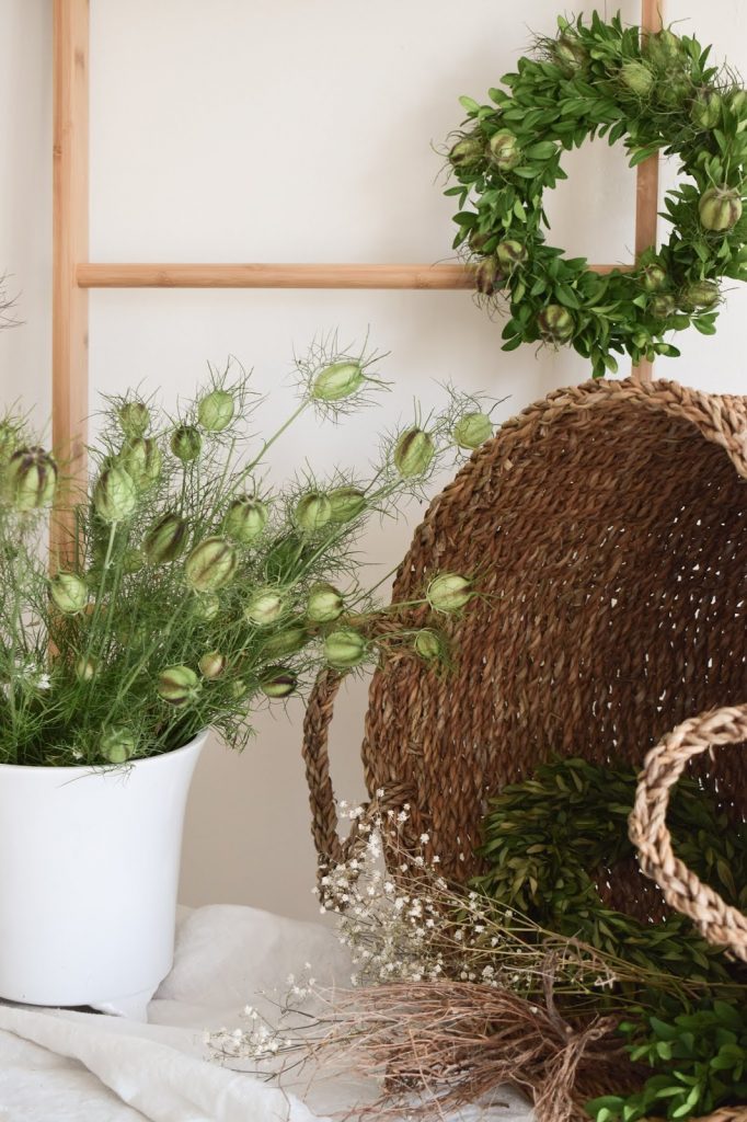 DIY Anleitung Kranz für den Sommer aus Buchs und Samenkapseln der Jungfer im Grünen. Selber machen Naturdeko natürlich dekorieren